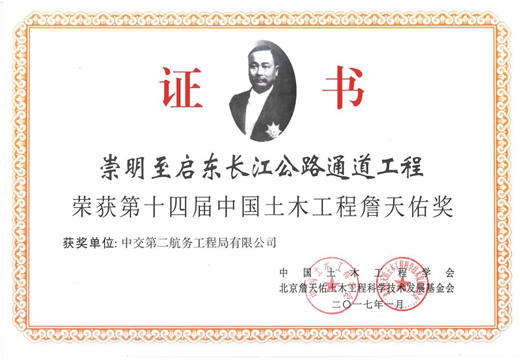 2017年崇明至启东长江公路通道工程获第十四届詹天佑奖