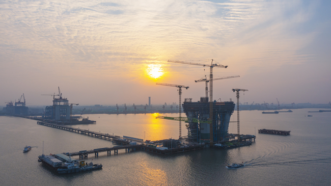 常泰长江大桥主航道桥主跨1176米,是目前世界最大跨度公铁两用斜拉桥,也是我国第一座集高速公路、普通公路和铁路“三位一体”的跨江大桥。大桥主塔总高352米,为世界最高桥塔,采用“空间钻石型”设计,分为上塔柱、中塔柱、下塔柱。在下塔柱与中塔柱交界处设置横梁,采用单箱单室截面,共布置2个横向横梁和2个纵向横梁。此次大桥北主塔下横梁浇筑混凝土方量共计8580立方米,钢筋用量共1800吨,施工规模等同于常规长江大桥下横梁的3到4倍。