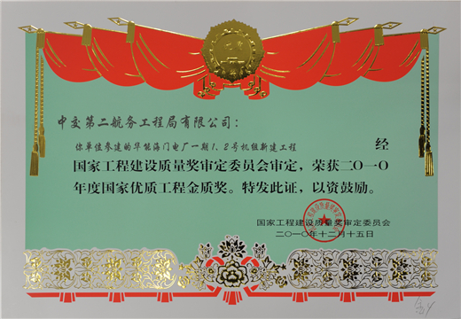 2010年华能海门电厂一期1、2号机组新建工程获国家优质工程金质奖