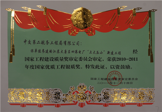 2011年江苏大唐吕四港电厂“上大压小”工程获国家优质工程银质奖
