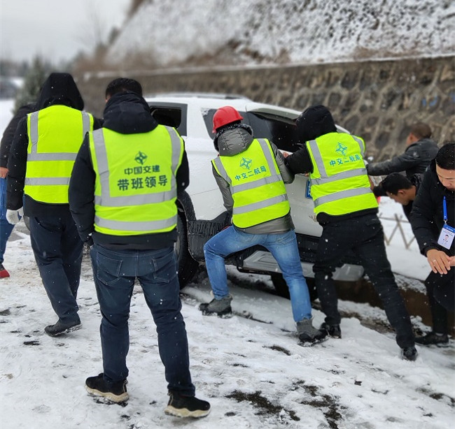 为消除安全隐患,尽快恢复G211国道的交通秩序,保证项目正常推进,中交二航局项目部及时抽调14名员工、4台车辆、2台装载机,携带铁锹、煤灰等除雪工具和物品,到本标段附近重点积雪路段沿途协助当地交警,对不慎滑入排水沟的车辆进行救援,并义务清雪。