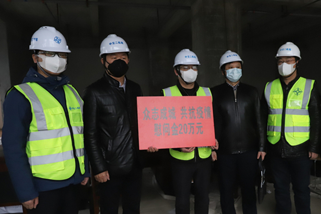 2月3日,受中交二航局党委书记、董事长由瑞凯委托,党委副书记、工会主席张文胜,党委委员、副总经理、总工程师施志勇一行代表公司党委,前往武汉华大病原生物安全实验室项目施工现场,向奋战在施工一线的200多名建设者致以亲切问候,并送去20万元慰问金。