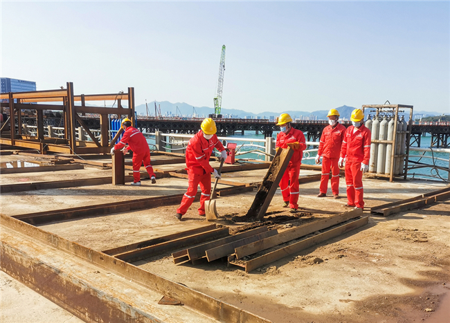 在海上工段,现场工人全程规范佩戴口罩作业,工地实行了全封闭管理,进入现场后一律不准私自外出。在班前会上,各分包队伍负责人还把防疫内容宣传作为一项重要工作,将疫情防控知识传达给每一名现场作业人员,确保所有人员落实到位。
