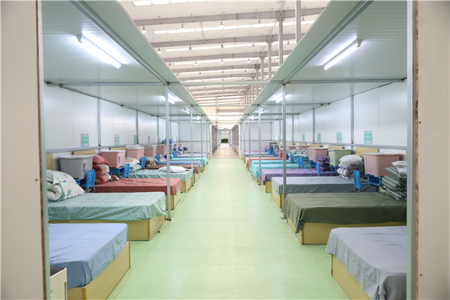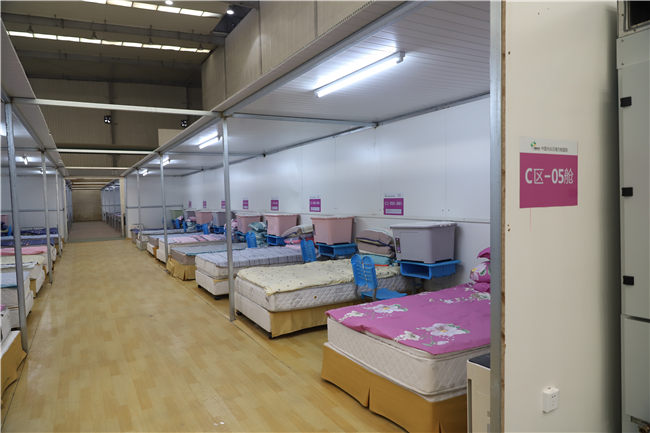 如今,医院的收治区设计每20个床位为一个舱,相对独立可防风,除每个床铺配有电热毯保暖并加厚棉被之外,每个厂区还安装柜机空调,满足病人的保暖需求。每个舱位配备了单独饮水机,可提供热水饮用;各舱区还集中配备了洗漱间、淋浴间和移动厕所,并24小时提供热水,可满足病人洗漱、淋浴需求。每栋楼还设计有专门供病人休息活动的区域,包括影视区、阅览区、图书角、零食饮料区,全区域WIFI覆盖,满足放松休闲、辅助治疗作用。