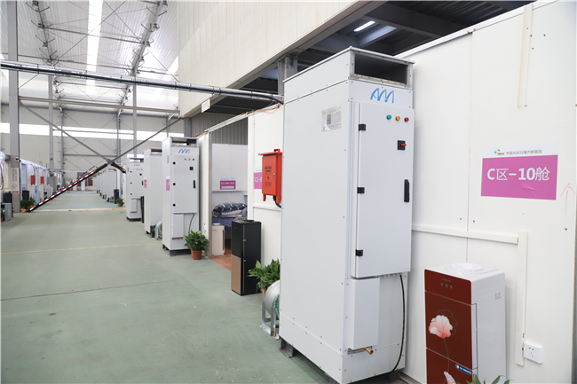 刘宜全介绍说,中交二航局负责的C区,由于床位较多,还配备了“芬兰雅威”大型空气消毒净化设备,采用“离子瀑技术”,24小时持续将方舱内的空气抽进设备内部,在设备内部完成杀毒灭菌净化,再将洁净空气送入方舱内,保持室内空气清新。