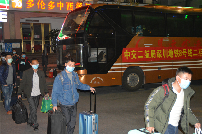 2月26日,中交二航局深圳地铁8号线二期二工区包车从四川省南充市、云南省昭通市、河南省驻马店市接返岗劳务工人。目前,先后3台车共计接回46人返回深圳。