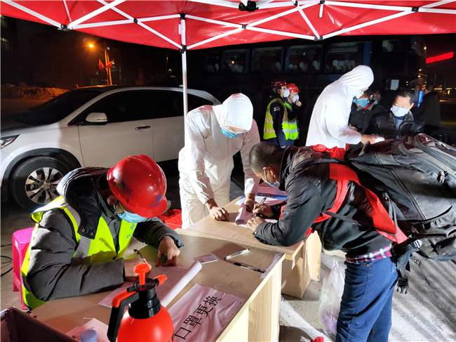 2月26日21时许,载有27名返岗工人的专用大巴抵达温州永嘉项目330国道改建工程朱白领隧道工区营地,这是永嘉项目部组织的第三批返岗工人。在营地现场,项目党员防疫先锋队和工区防疫工作小组成员逐一查看工人的健康码,并为工人进行体温检测,建立健康档案,同时发放消毒用品……所有返岗工人严格按照流程进入营地。