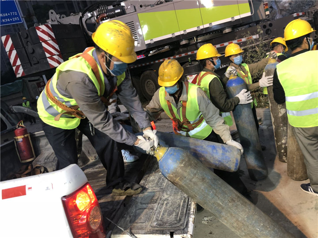 接到指令后,中交二航局福厦铁路6标项目部立即行动,迅速成立应急救援小组,并组建了一支66人的救援队,抽调平板车2辆、汽车13辆、电焊机2台、氧割9台、风枪15套、电镐9套、氧气20瓶、丙烷9瓶、潜孔钻1台、安全绳400米、电箱电缆线等各种设备连夜装车待命。因救援地点的特殊性,项目部为每名救援人员配备了手套、医用口罩等一系列防疫物资,保障员工生命安全。