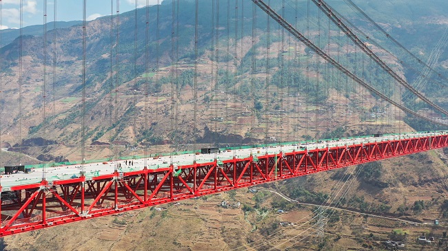 金安金沙江大桥钢桁梁采用板桁分离的方式制作和安装。桥面板单块长25米、宽9.5米,最大重量达65吨。