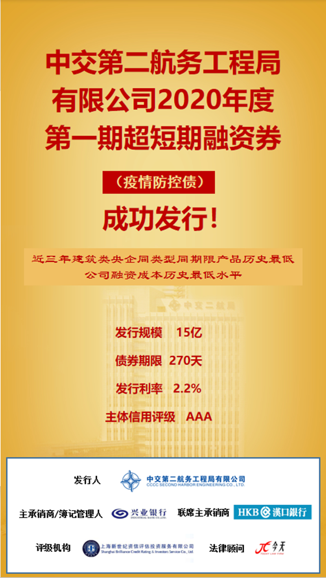 3月27日,中交二航局15亿元超短期融资券在银行间市场成功发行,该融资券由兴业银行和汉口银行承销,平均期限270天,综合融资成本2.2%,为近期同类企业的最优水平。发债资金全部用于企业置换高息债务和流动性安排、补充抗疫支出。