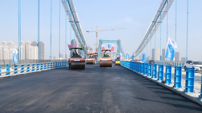 4月24日,中交二航局投资建设的汉江上首座三塔式悬索桥——襄阳庞公大桥主桥开始沥青摊铺施工,这也是该项目复工后取得的重要进展。