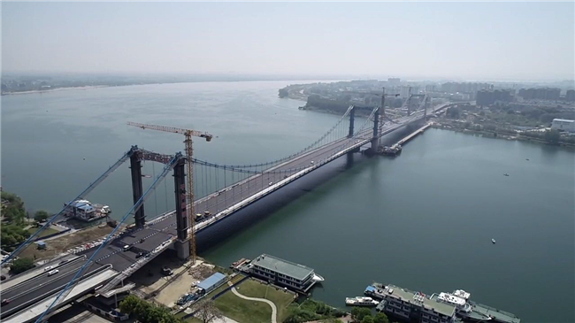 “三塔钢混结合梁悬索桥施工关键技术研究”首次研发了低热、低收缩、低粘度超高性能混凝土(UHPC)并应用于桥梁索塔钢混结合段大体积混凝土施工,有效解决了混凝土(UHPC)易开裂的技术难题,研发了小直径圆形地连墙液压抓斗成槽施工方法,解决了强透水砾石地层成槽的技术难题,研发了三塔悬索桥空间缆索股架设技术,保证了外倾式主缆架设精度。——应用于襄阳庞公大桥
