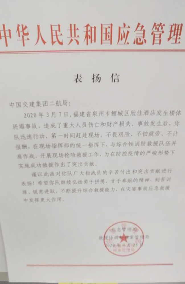 近日,中交二航局收到一封来自国家应急管理部的表扬信,信中高度肯定了中交二航局救援力量在泉州欣佳酒店坍塌事故救援中的辛苦付出和突出贡献。