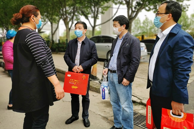 这是今年4月,姚本思带队慰问一公司武汉市内海外职工家属时的一幕。