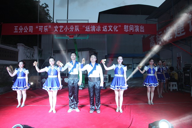 2014年7月,五分公司“可乐”文艺小分队在孝感项目正式登场试演,职工反响强烈。这给了小分队更足的信心,姚本思带领着小分队向着崇山峻岭中的中交蓝出发了。这才有了在秦岭深处那一场场受到热烈追捧的演出。