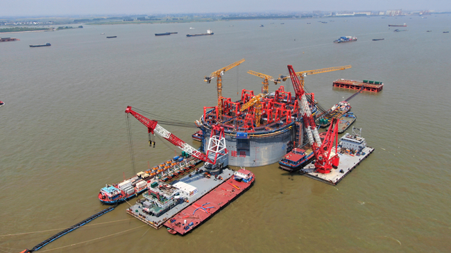“沉井需要下沉到原始河床面以下50米处,依靠自身重量与下沉深度,牢牢扎根于河床底部,为大桥上部结构提供支撑。”中交二航局常泰长江大桥项目部常务副总工吴启和介绍,“沉井取土下沉共分5次,首次取土下沉深度为5.2米。为控制沉井姿态,确保沉井平稳下沉,首次下沉共分十轮取土,计划用时20天,总取土方量约为25000立方米。”