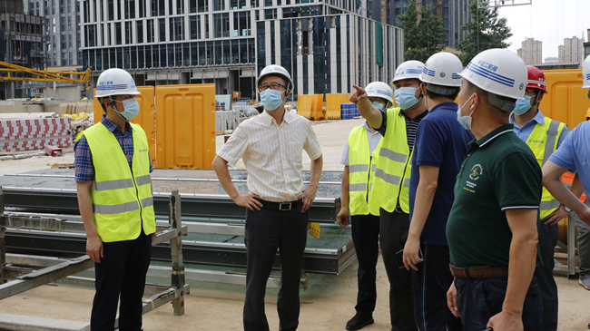 王海怀一行在施工现场听取了关于项目进展的汇报,了解了项目投资、设计、建设、运营等情况,对项目疫情防控和复工复产工作给予肯定,表达了对华中·中交城项目建设的期待与关心。王海怀指出,华中·中交城项目作为中交集团在华中区域投资建设的重要项目,下一步要加快推进项目建设、加强经营管理,发挥中交集团的品牌优势、产业链优势,打造精品工程,创好“中交城”品牌。