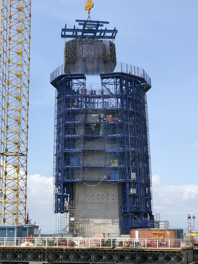 中交二航局承建的深中通道伶仃洋大桥东索塔为门式塔,由两根塔柱和下、中、上三道横梁组成,高270米,为世界最高海中桥塔。此节段钢筋部品高4.5米、重约65吨,在工厂快速拼装成型,采用MD3600塔吊整体吊装对接。东索塔共有不同截面的钢筋部品82节段。