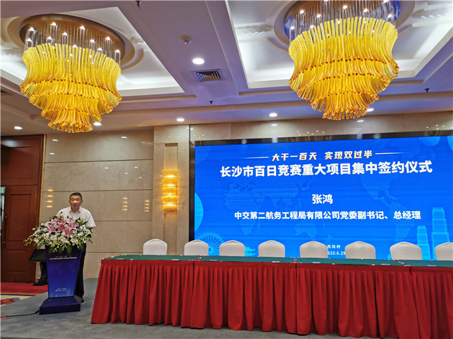 6月29日,由长沙市人民政府主办,长沙市商务局、长沙市投资促进事务中心承办的湖南-长三角经贸合作洽谈周长沙分会场活动暨长沙市“大干一百天、实现双过半”百日竞赛重大项目集中签约仪式在长沙举行。这是长沙在统筹疫情防控和经济社会发展期间开展的首个市级重大招商活动,也是长沙市落实“六稳”“六保”重大决策部署的重要活动。中交二航局党委副书记、总经理张鸿应邀参加仪式,签约中交长沙总部基地项目并作为签约代表发言。