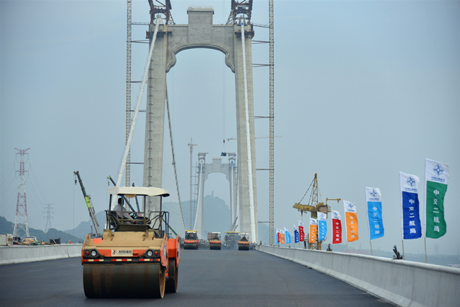8月22日,由中交二航局承建的五峰山长江大桥公路段率先完成沥青铺装任务。