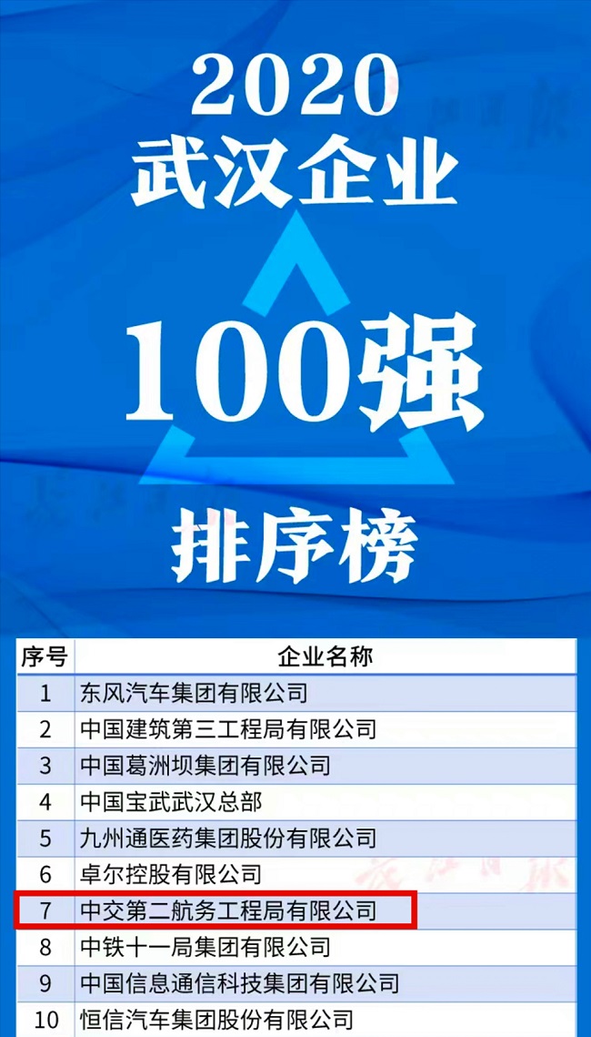 9月25日,2020年武汉企业100强名单正式公布,中交二航局位列第7名,比2019年上升1位,比2018年上升2位,连续两年保持上升!