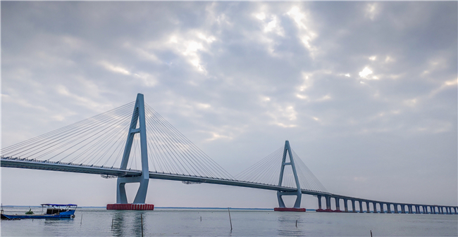 东雷高速公路是广东省重点交通建设项目,路线全长约47公里,设计行车时速100公里。中交二航局承建的TJ2合同段长约10公里,主要施工内容包括通明海特大桥主桥、东引桥、西湾大桥、教门港大桥等。