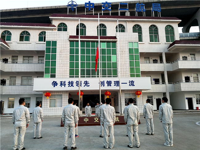 2月19日,中交二航局黄冈市唐家渡口岸项目部举行了庄严的升国旗仪式。伴随着激越昂扬的国歌声,五星红旗冉冉升起,项目部全体员工向国旗行注目礼,激发新动力,驶向新征程。(一公司 付双舟)