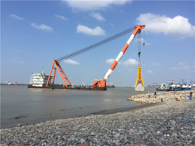 长江南京以下12.5米深水航道二期工程位于长江下游南通(天生港区)至南京(新生圩港区)河段,航道全长约227公里,重点整治福姜沙水道、口岸直水道、和畅洲水道和仪征水道。项目建设内容包括新建主堤6道、丁坝30座、护滩带22座、护底带4道,加固护岸长约47.4公里,航道疏浚1983万立方米,并配套建设导助航设施及其他相关设施。中交二航局负责施工的仪征水道整治工程,位于镇江市世业洲西侧,工程由头部潜堤、头部潜堤南北侧丁坝、右缘丁坝、左汊护底带以及护岸组成,共形成堤身长度5.2公里、护岸长度11.6公里。
