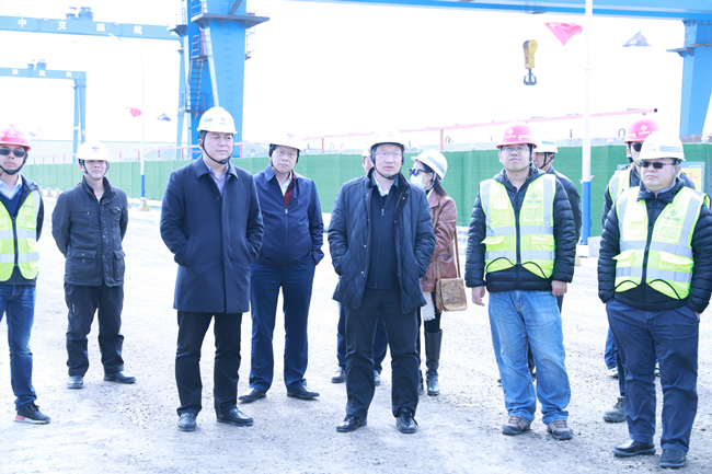 张鸿一行先后来到码头平台、陆域堆场以及房建附属建设区域,详细了解现场各工序施工进度与技术重难点,与现场管理人员深入分析项目组织协调、技术方案优化等问题,并针对高桩码头装配化施工关键技术展开探讨,同时充分肯定了项目团队在工期紧、疫情防控严峻双重压力下的管理理念及管理成效。