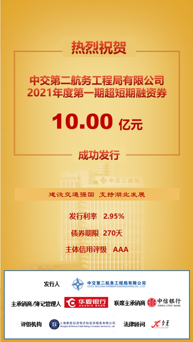 3月10日,中交二航局2021年第一期超短期融资券在银行间市场成功发行,发行规模10亿元,由华夏银行和中信银行联合承销,债券期限270天,票面利率2.95%。 此次超短期融资券成功发行,受到市场投资者的广泛欢迎和热烈参与,再次充分体现出市场对于企业履约能力和优质品牌的高度认可,进一步强化了公司优质发行人形象,助力公司朝着“十四五”规划发展目标坚实迈进。(财务资金部)
