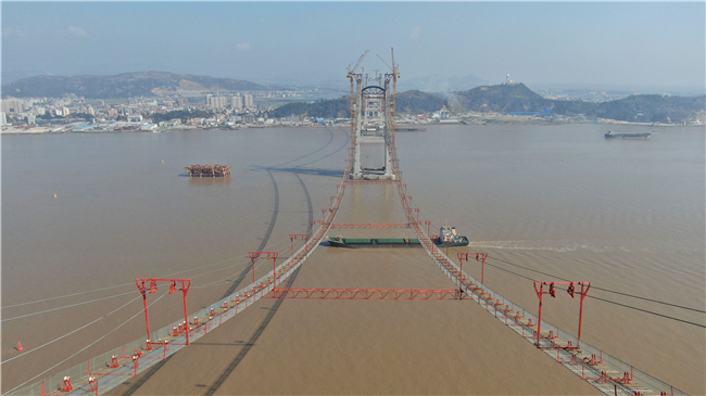 下方是滚滚瓯江,脚下是镂空的猫道。在施工现场,中交二航局建设者们行走在天路一般的施工便道上进行主缆架设作业。
