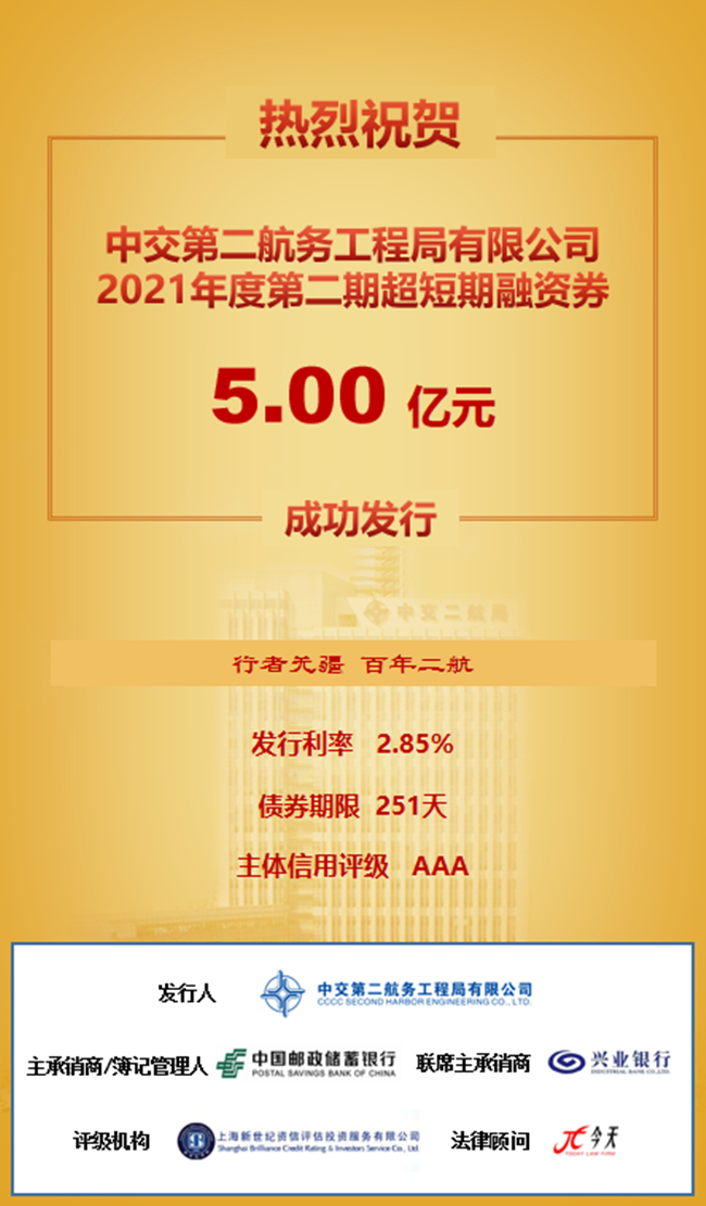 4月14日,中交二航局2021年第二期超短期融资券在银行间市场成功簿记发行,发行规模5亿元,由邮储银行和兴业银行联合承销,债券期限251天,票面利率2.85%。