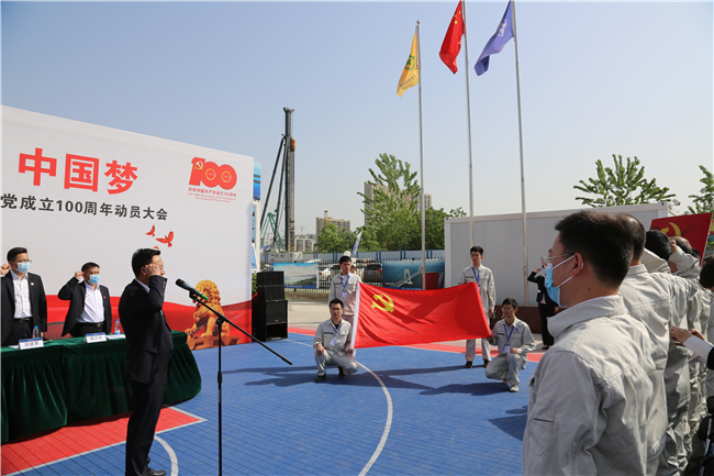 与会全体党员重温了入党誓词;相关项目部党支部书记、优秀青年党员、先进个人代表分别作了表态发言;六分公司领导为党员突击队、工人先锋号、青年突击队代表授旗;长江新城项目部党员突击队队员进行了集体宣誓;全体参会人员进行了践诺签名;在汉项目部党支部集中开展了党史学习教育对标交流。