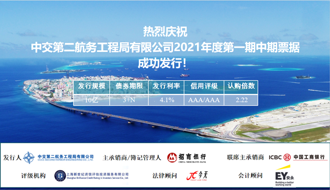 5月11日,中交二航局在银行间市场成功发行2021年度第一期中期票据,发行规模10亿元,期限3+N年,全场认购倍数2.22倍,票面利率4.10%,创今年5月以来华中地区同品种同期限债券发行利率新低。