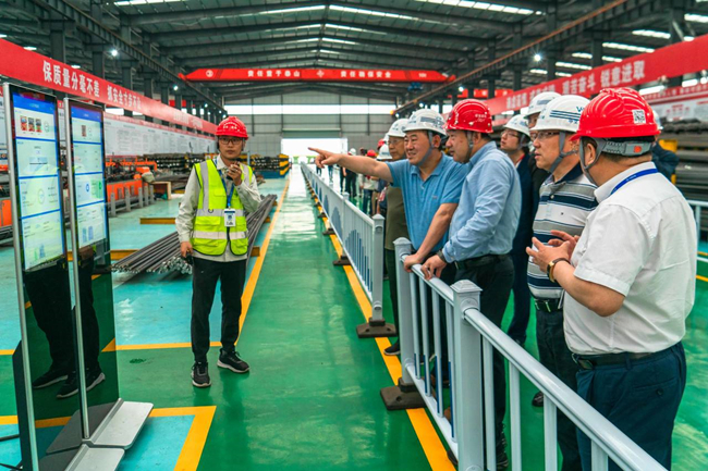 在常泰长江大桥,专家团先后考察了主桥6号墩承台施工现场和钢筋加工厂,参观了大桥监控指挥中心和产业工人培训中心,详细了解了常泰长江大桥主桥沉井施工、BIM协同平台和智能制造以及平安工地建设情况,并围绕大桥材料应用、关键技术控制等展开交流,提出了意见和建议。专家团各位院士和专家对大桥台阶型沉井设计施工和智慧工地建设取得的成绩表示肯定,赞许二航局自主研发的短线匹配法节段梁预制自动流水线工艺,同时希望建设团队坚持建管养一体化的理念,根据实际需求,在钢箱-核芯混凝土锚固结构、CFRP碳纤维拉索、节段梁预制等方面开展有针对性的研究,不断丰富完善和总结提升,进一步实现大桥建设技术的创新突破。