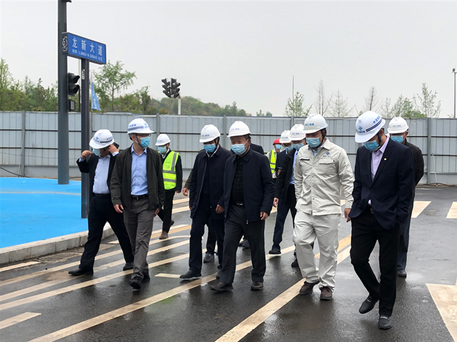 4月6日,中交集团党委常委、副总经理王建到二航局成都简州新城项目龙新大道检查指导工作。