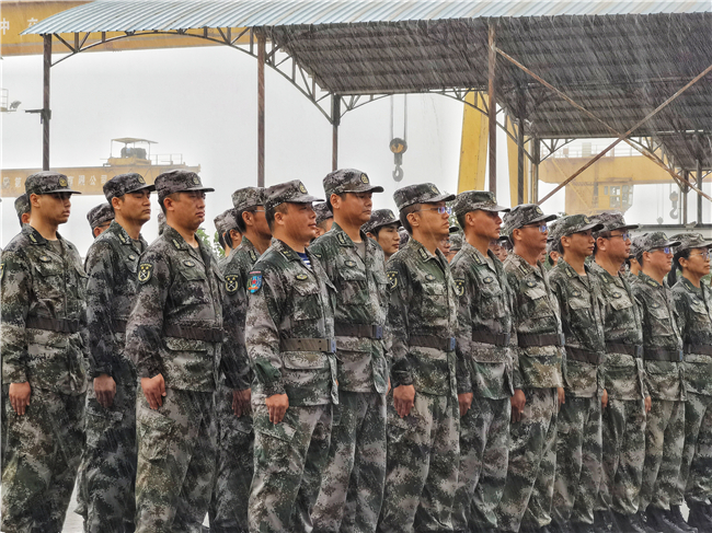 暴雨中,中交二航局民兵工程应急抢修分队开展了点验及队列会操,并针对近期防汛形势严峻的实际情况,现场开展了防洪抢险应急演练。