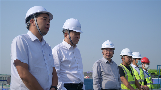 王建平一行前往施工现场,详细了解项目当前施工情况,并仔细检查项目部在履行安全生产责任制、风险防控、隐患排查治理、应急管理等方面工作落实情况,以及在疫情防控、环保等方面工作开展情况。