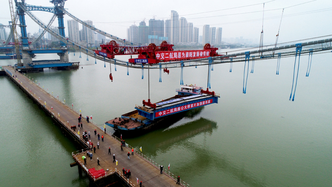 10月9日上午,中交二航局承建的襄阳庞公大桥主桥加劲梁完成首片吊装,标志着汉江首座世界第四座三塔悬索桥进入关键的主桥架梁施工阶段,预计年底全桥贯通。