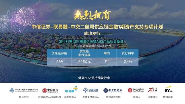 12月23日,中交二航局在上海证券交易所成功发行首单供应链ABS资产支持专项计划,发行规模6.41亿元,期限1年,发行利率3.4%,发行价格创同期限供应链ABS产品历史新低。同时,储架50亿元后期持续发行。