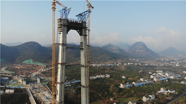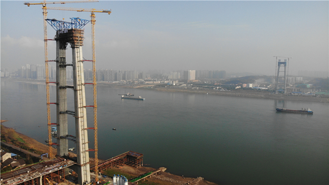 伍家岗长江大桥全长2813米,主桥采用主跨1160米悬索桥一跨过江方案,大桥于2017年初开工,今年9月南北岸主塔成功封顶。
