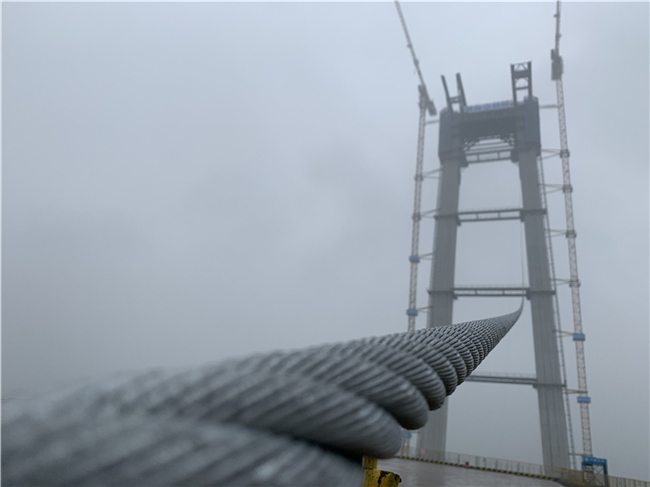 此次先导索施工采用的是“水上牵引法”,需要7个工点同步施工,其中大桥南北锚碇两个工点之间相距超过1500米,跨越山地和长江。作业过程中,2艘1200马力的拖轮将两根先导索(直径32毫米、长2350米的高强度钢丝绳),分别由南北两岸主塔处向江中心的定位驳船处牵引。经过近3小时的紧张作业,两根先导索顺利完成对接。随后,南北两岸主塔顶端的卷扬机启动,将先导索提升至距离江面30米的高空。在大桥后续施工过程中,将利用先导索来回拉拽牵引,逐步形成“猫道”施工平台,从而搭建起空中跨江施工的“栈桥”。