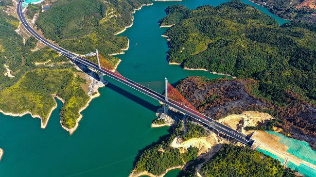 中交二航局承建的TJ5标段,起于岩镇镇,终于赤光镇,全长12.86公里,包含全线关键工程枫树坝特大桥、下营莨隧道等。自进场以来,中交二航局建设者克服了场地受限、高空作业安全风险大、地质情况复杂、交通不便等困难,绿色、安全、优质、高效地完成了施工任务。