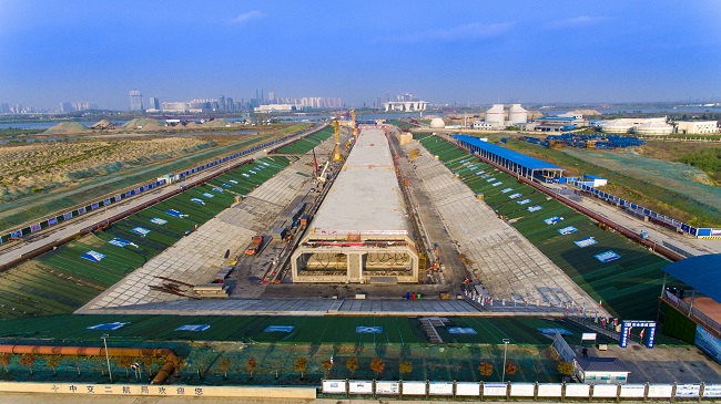 襄阳东西轴线是联系樊城老城区与东津新区的新快捷通道,全长26.3公里。中交二航局承建的鱼梁洲段全长5.4公里,为双向6车道城市快速路,主线设计时速60公里,以隧道施工为主,其中下穿汉江的沉管隧道总长约1公里,为汉江第一条公路隧道,也是华中地区首条沉管隧道、国内整体建设规模最大的内河沉管隧道,具有引领内河沉管隧道技术发展的重要意义。(夏威 摄影;邹志贤 魏小飞报道)