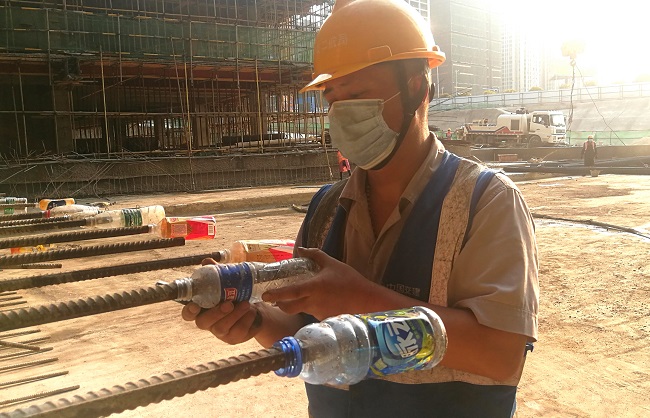 “虽然一个月后要进行负2层地下室的施工,但这钢筋头伸出来,总不是个事啊。怎么处理才更安全呢?”项目部安监部副部长王俊杰原本计划拉上安全警示线的。可他又想到,钢筋头风吹日晒会生锈,怎么处理既安全又有效呢?王俊杰突然想到手上的矿泉水瓶,“有了,就它了……”