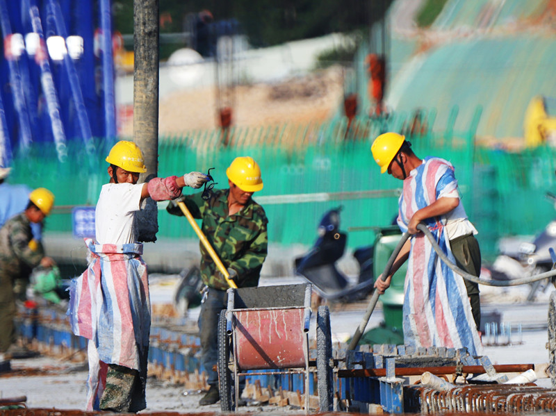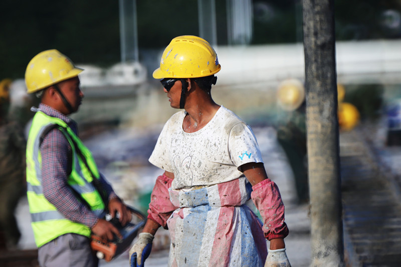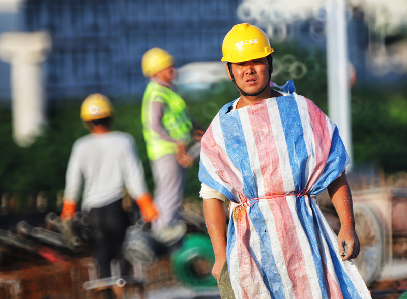 近日,在中交二航局福州新洪塘大桥施工现场,工人冒着30多度的高温,浇筑桥面护栏底座混凝土。为防止混凝土溅到衣服上,振捣工人自制彩条布防护服,来了一场高温时装秀!
