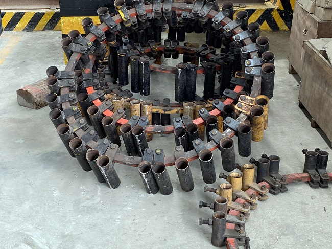 这种钢板,分为前后两块,平行装置在滚笼机前后。为了使前后钢筋保持在一个平面上,前面的钢板起定位作用,可移动可旋转,后面的钢板起导向作用,保证直螺纹套筒能够自由穿过。根据现场施工所需笼种,蒋昌学在钢板上逐环设置了四种大小的圆孔,分别用以制作1.2米、1.3米、1.4米和1.6米直径的钢筋笼。这个设计,使固定套筒模具彻底成为了历史。