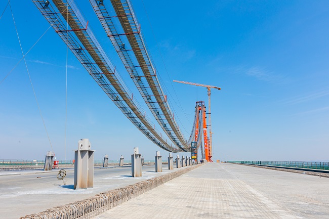 “对于自锚式悬索桥而言,要求结构内力最终状态符合设计要求,控制主缆索股架设精度、各索股张力匀值性、索夹初始安装位置以及后续体系转换等是我们的工程重点和难点。”中交二航局项目部总工程师吴在雄介绍。