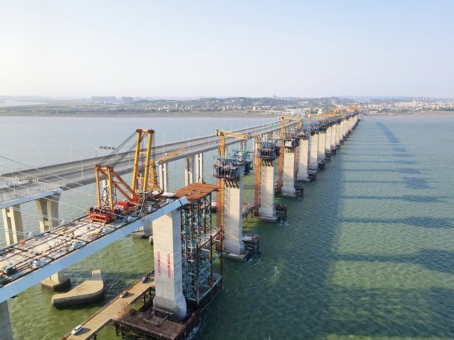泉州湾跨海大桥是全国首座跨海高铁桥,全长约20公里,海上桥梁长约9公里,预计于2022年底建成通车。(高赐智 胡晓虎)