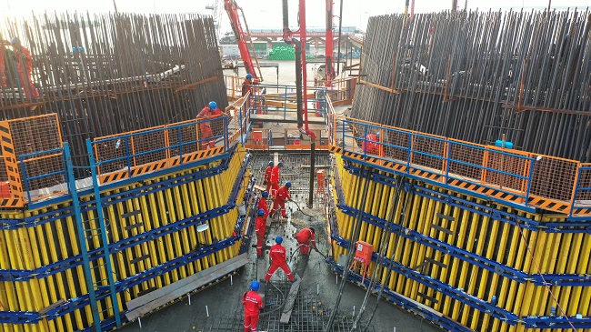 近日,中交二航局承建的江苏常泰长江大桥5号墩主塔开始塔座及塔柱混凝土浇筑施工。